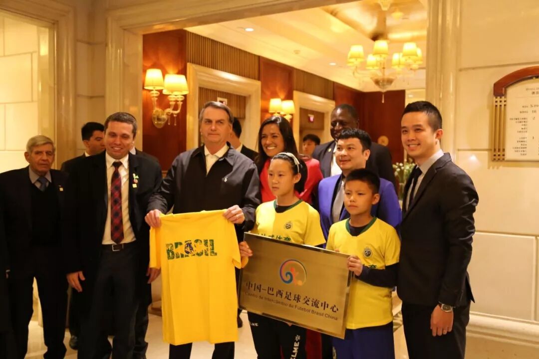 10月24日,巴西总统博索纳罗抵达北京开始对华国事访问。当天下午,巴西总统在北京瑞吉酒店参加了中国巴西足球交流中心的成立仪式,并与中国青少年足球球员代表——温州仰义二小的两名小球童,进行了会面和互动。