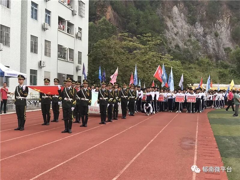 两点三十分,开幕式正式开始。首先进行的是入场仪式。国旗、会旗方阵率先入场,身穿深绿色制服的国旗护卫队将鲜艳的五星红旗和绿色的会旗簇拥在中间,神情肃穆,迈着整齐的步伐,脚步声沉稳有力。怀着对国家的崇敬和热爱,全校师生对国旗、会旗行注目礼。