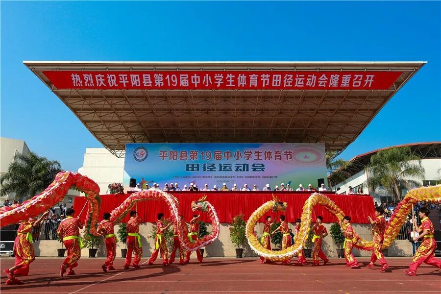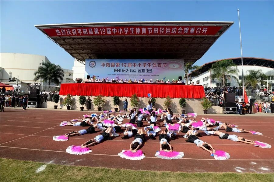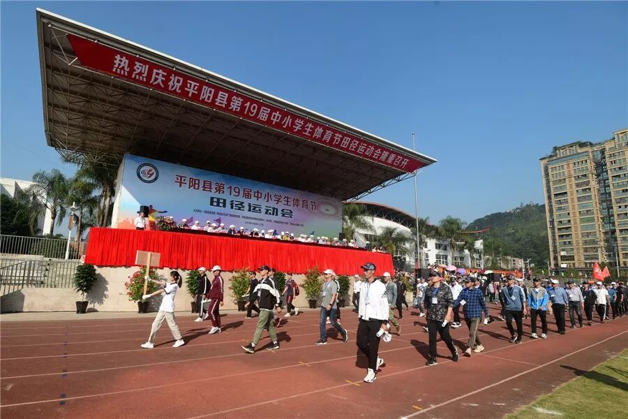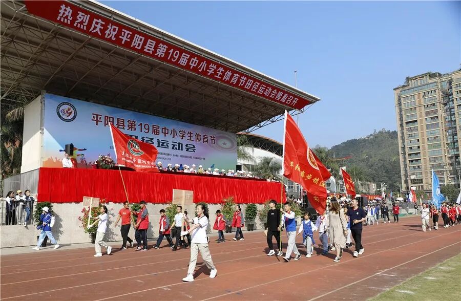 金秋时节,硕果飘香;乐曲高奏,彩旗飘扬。10月24日上午,平阳县第19届中小学生体育节田径运动会开幕式在水头一中举行。东道主平阳县水头镇第一中学校长王平致欢迎词,县文化和广电旅游体育局党组书记、局长王扎艇致辞,县教育局党委书记、局长易际亮致开幕词,县人民政府副县长林月和宣布运动会开幕。开幕式由县教育局副局长章青盛主持。