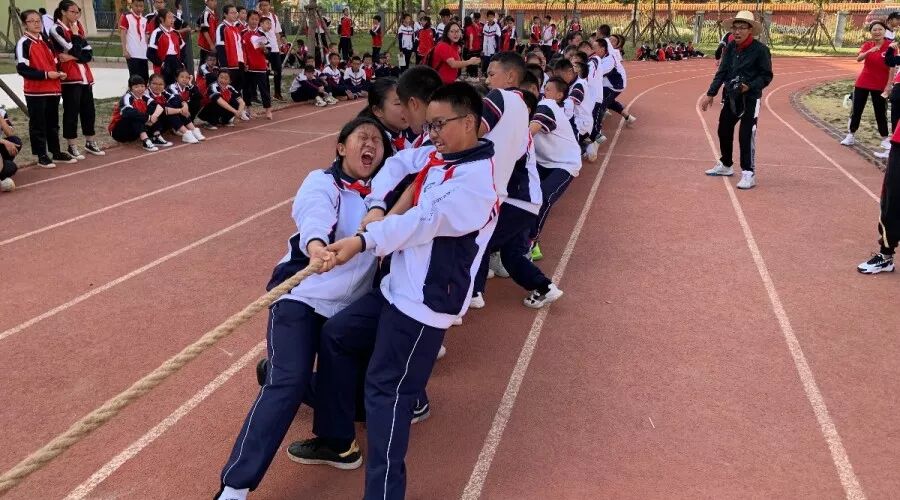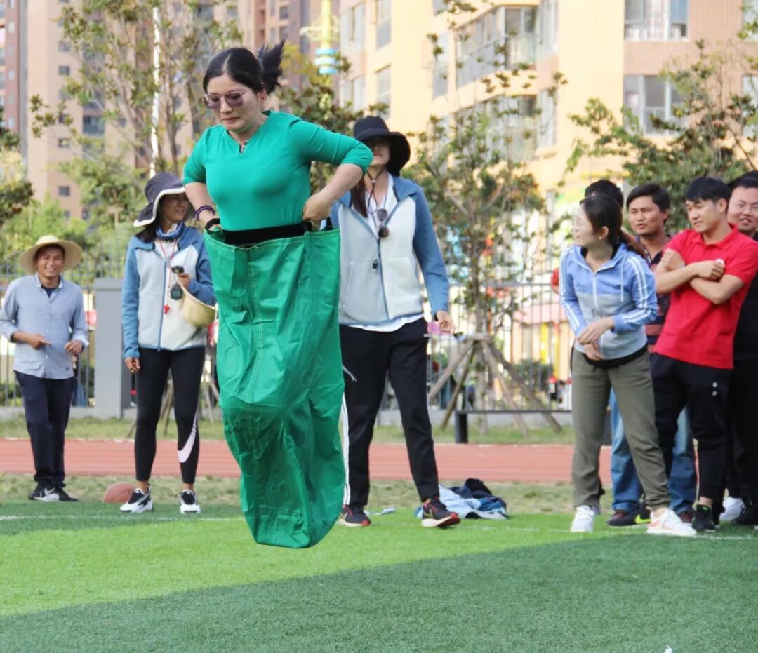 我们亲爱的老师们,也放下了教鞭和书卷,来到赛场上,一展实力。欢快非常的“袋鼠跳”,一个个女老师披散的长发在风中“凌乱”着,虽然“凌乱”,却也欢乐,一个个男老师,仓皇也帅气,蹦跳之间,尽洗平日工作的疲惫,这时候的你们没有了平日的严肃与端庄,与身着校服的少年无异,恣意笑颜是蓝天下最具活力的风景。一旁学生们卖力地喊着加油,师生之情,共此一心。