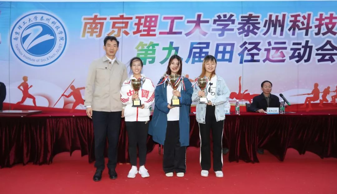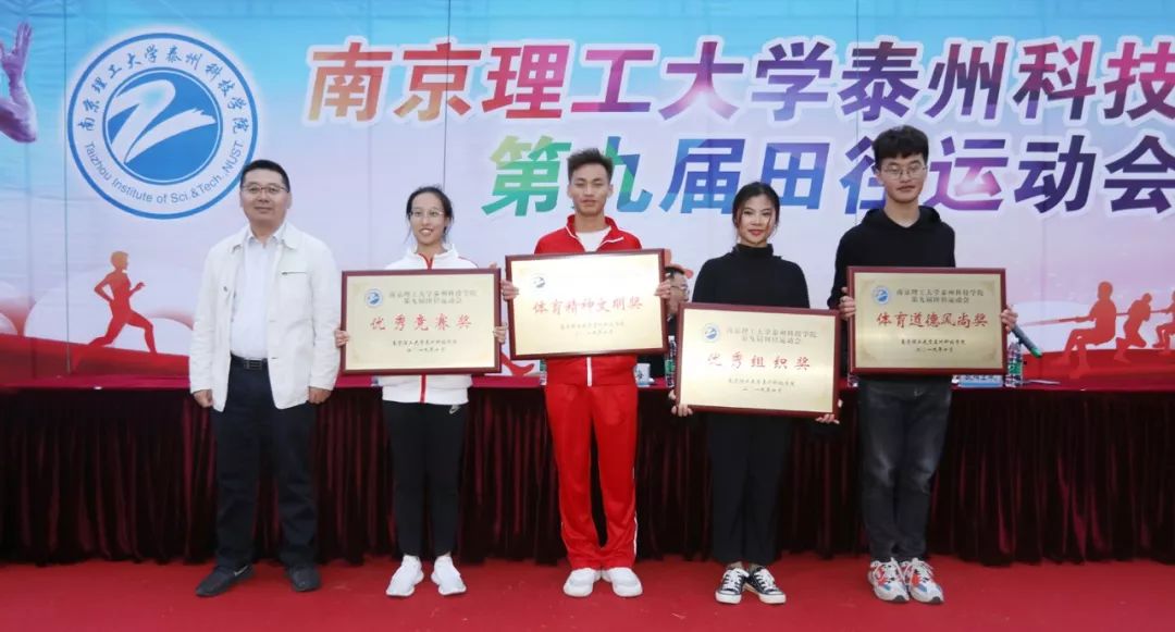 颁奖仪式代表着运动会的结束,揭晓赛场上英雄的时刻。经过一天奋战,智能制造学院获得团体总分、男子团体、女子团体的三项第一名,实现大满贯;检验检测学院与药学院连队获得团体总分第二、女子团体第二的好成绩;商学院获得团体总分第三、男子团体第三。根据评审组的督察评选,城市建设与设计学院获得体育道德风尚奖、移动互联网学院获得体育精神文明奖、外国语学院获得优秀竞赛奖、继续教育学院获得优秀组织奖。经过一天紧张激烈的比赛,南京理工大学泰州科技学院第九届田径运动会圆满落幕。