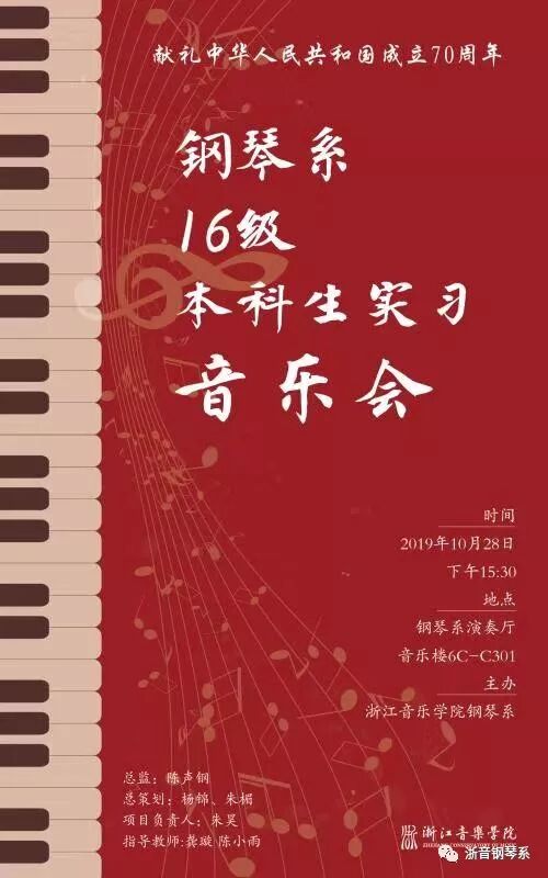 金秋十月,献礼中华人民共和国成立70周年,我系将于下周一下午举行钢琴系本科生实习音乐会。