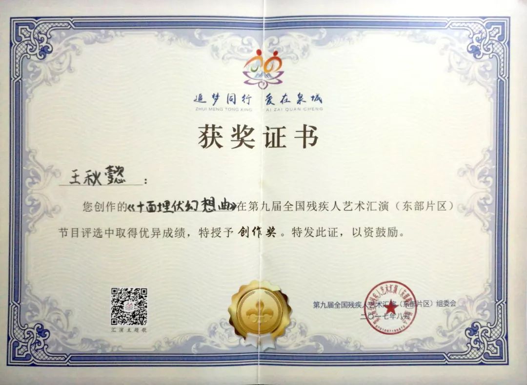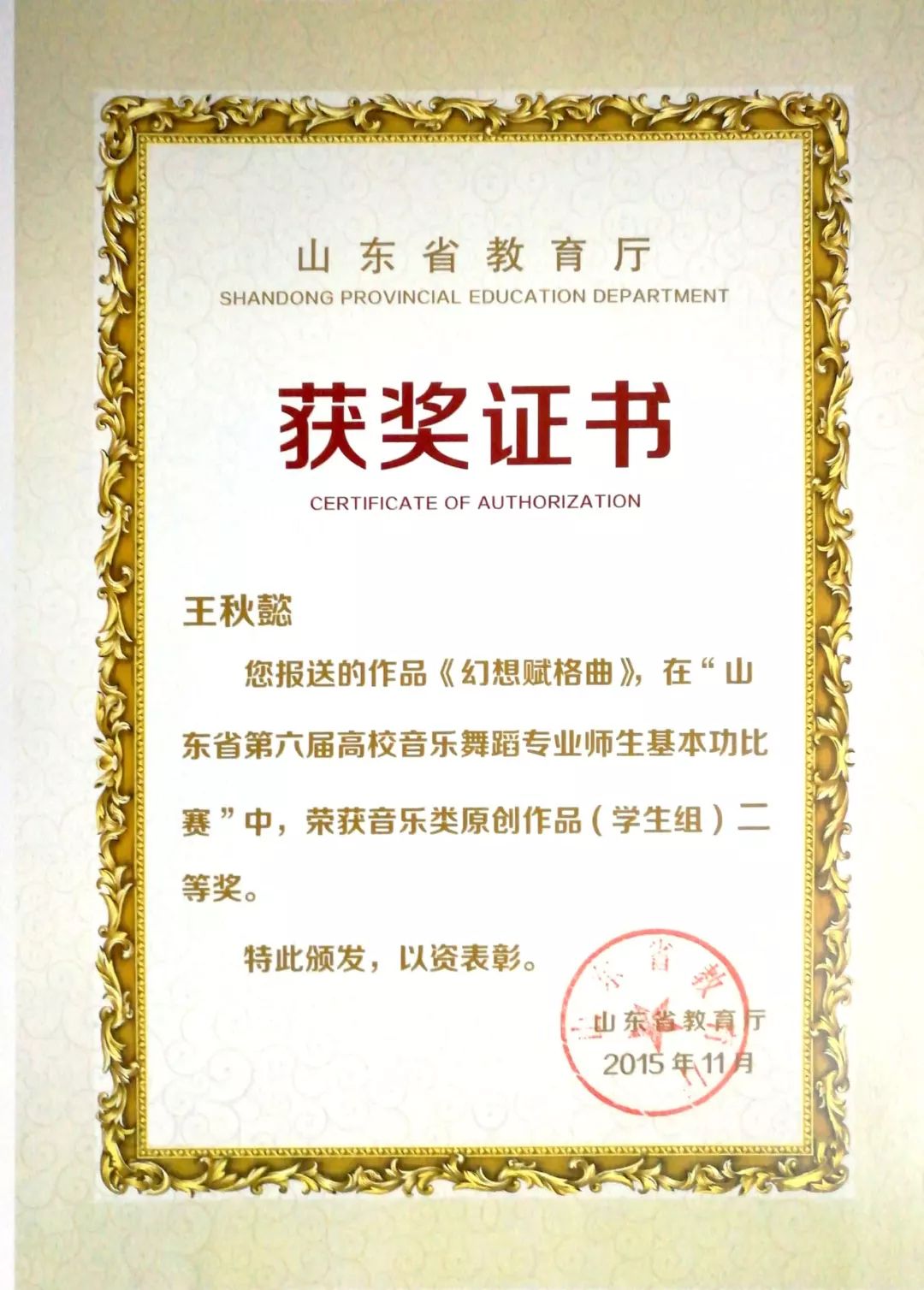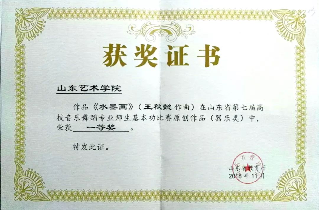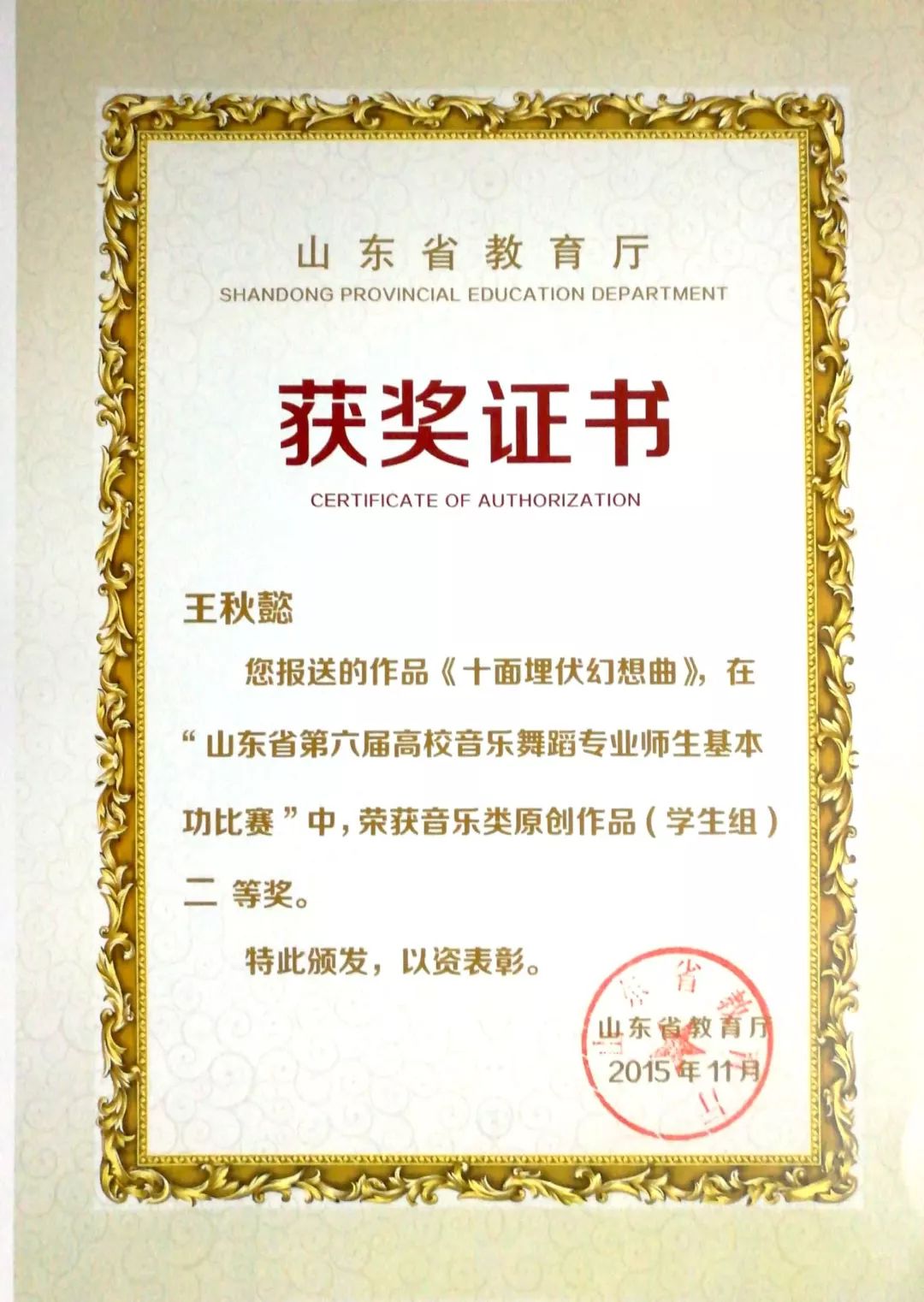 在山东省第六、七届高校音乐舞蹈专业师生基本功原创作品比赛中,她演奏的都是自己创作的作品,《云端》获一等奖,《十面埋伏幻想曲》《幻想赋格曲》获二等奖,《水墨画》获三等奖。演奏自己创作的作品并获奖,这在同龄人中都是少有的,秋懿已然成为一位创作型青年钢琴演奏家。
