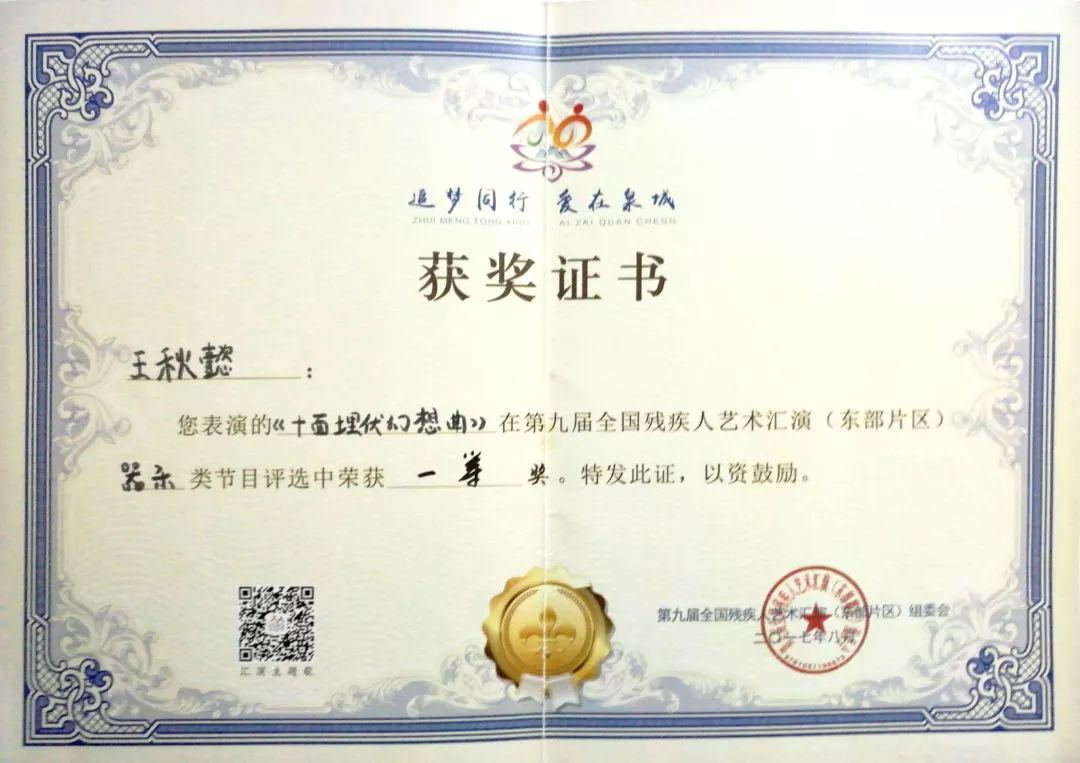 1992年出生的秋懿,自幼双目失明,被鉴定为视力一级残疾,秋懿从小喜欢唱歌,天生有一双灵敏的耳朵,能演奏钢琴、二胡、柳琴、中阮、月琴、葫芦丝、手风琴、双排键、口琴、笛子等多种乐器。这样一个素质优、有潜力的苗子得到山东艺术学院音乐学院院长李云涛的赏识,顺利入学并获得本科和研究生学位,为今后的发展打下良好的基础。