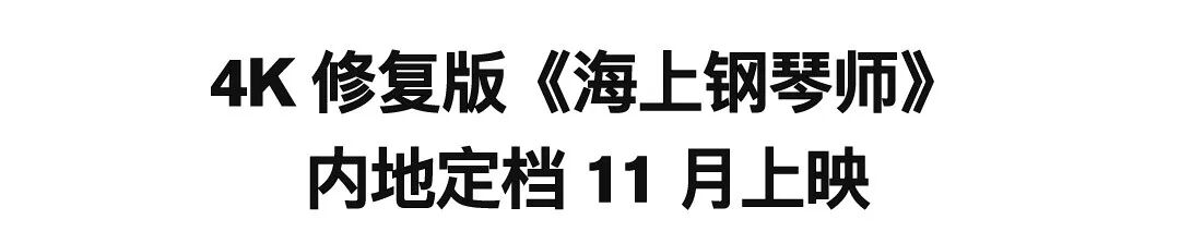 经典电影《海上钢琴师》4K 修复版定档 11 月 15 日在国内上映,目前已曝光了定档海报。该片由朱塞佩·托纳托雷导演,蒂姆·罗斯主演,最早于 1998 年 10 月 28 日在意大利上映。故事讲述了一个被命名为「1900」的弃婴在一艘远洋客轮上与钢琴结缘,最终成为钢琴大师的传奇故事。影片中有一场激昂的斗琴片段堪称经典中的经典。时隔 20 年,此片要以全新的画质与国内的观众朋友见面,大家期待吗?