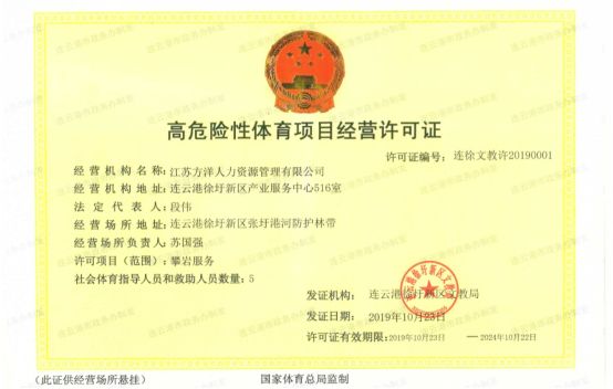 2019年10月23日,经江苏方洋人力资源管理有限公司积极申报,徐圩新区拓展训练基地成功获批高危险性体育项目经营许可证,这标志着徐圩新区拓展训练基地一期项目(攀岩、重走长征路等)正式具备运营条件。