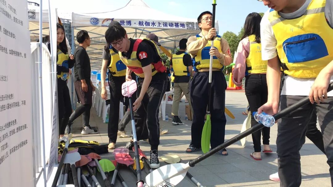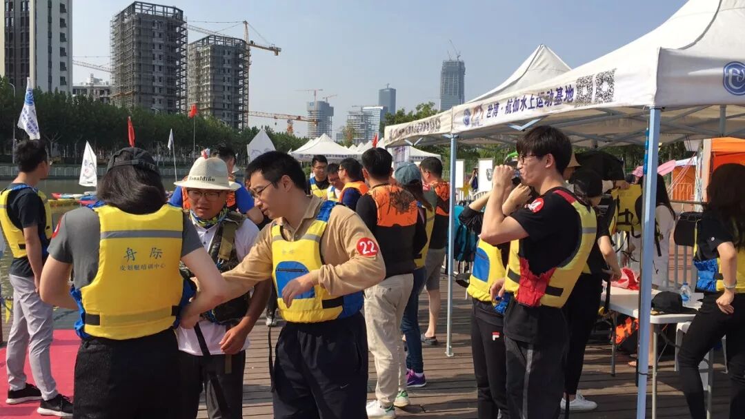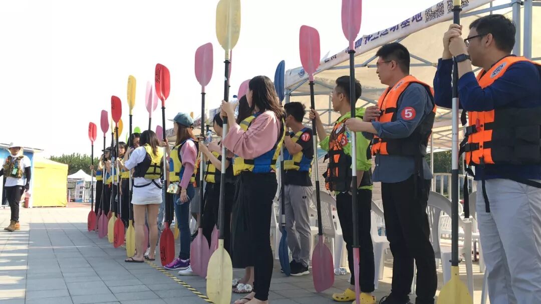 经过简单培训后,嘉宾们互相帮助,穿好救生设备,选好桨,开始三三两两上艇了。After a brief training, the guests helped each other to put on their lifesaving gear, chose their OARS and started to get on the boat .