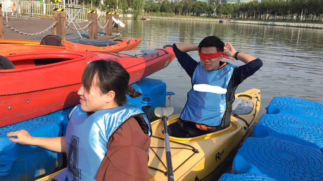 The game is easy to make you think of a hot song sing by Linyoujia -- "you are my eyes" ,rules of the game is, the male guest sitting in the back seat of the tow-man kayak, rowing, but his eyes be covered, the female guest sitting in the front of the tow-man kayak, indicating the right direction of the boat, and then competing with 9 other teams, come on!