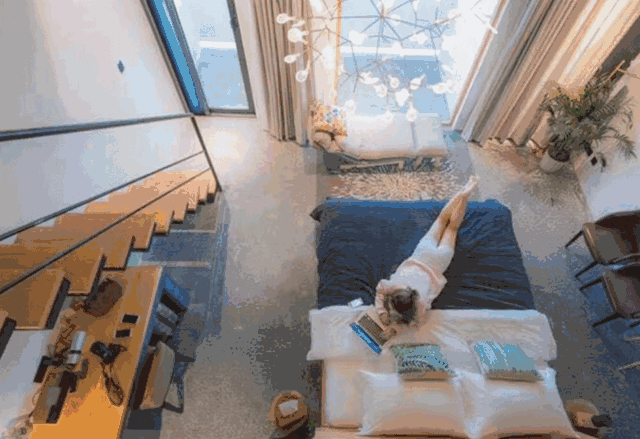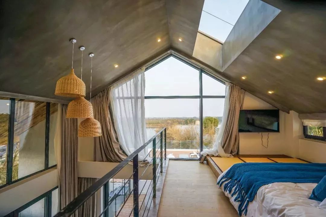 |loft房型,二楼是2.4米长的榻榻米床,面临180度落地窗