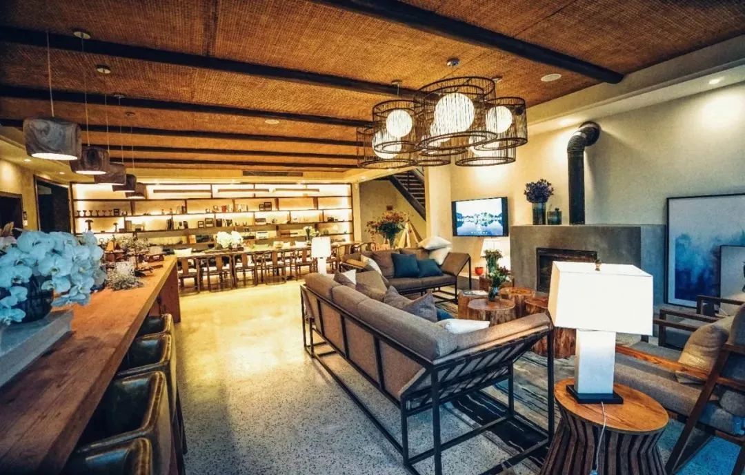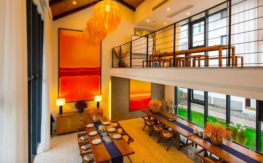但内装不似外观的岑寂,咖色沙发、藤条屋顶、鲜艳挂画,将低调的艺术感诠释得恰到好处。