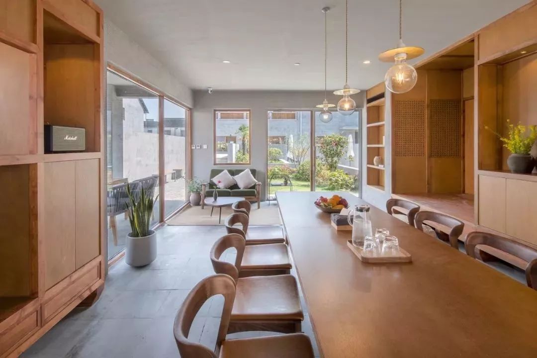 大厅向着院内的落地窗,将院内景色丝毫不放的收入厅中。长长的餐桌,暖色的吊灯,把原木色的质感衬的恰到好处。再适合不过家庭朋友一起出游了。