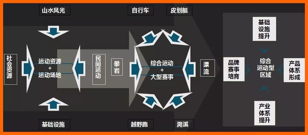 综合运动驱动型依托特殊的自然地理条件,整合成可以包含山地自行车、皮划艇、攀岩、越野跑、速降、溯溪、漂流、皮划艇、暗河穿越、滑竿等中的三种以上体育活动,形成综合赛事,依托综合赛事,进行多方位营销,引领产业转型升级。