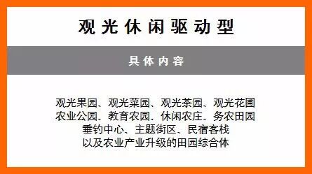 观光休闲驱动型以农业种植形成的景观、活动,生活方式等为资源载体,满足人们观光、采摘体验、农耕体验、田园生活方式体验、休闲、度假的功能,并推动相关服务业态的形成,实现多种业态的并行。提供融旅游、购物、休闲于一体的产品,从而获得身体和精神双重愉悦的消费业态聚集地。