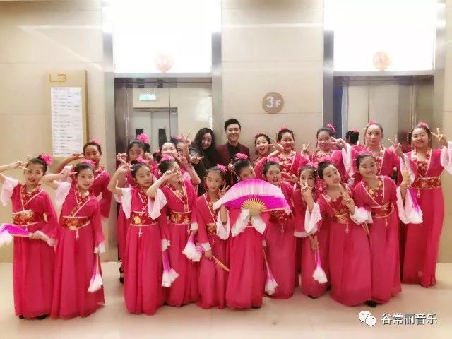 校长、著名主持人哆来咪与古筝学员们的合影,哆来咪右侧是悦悦