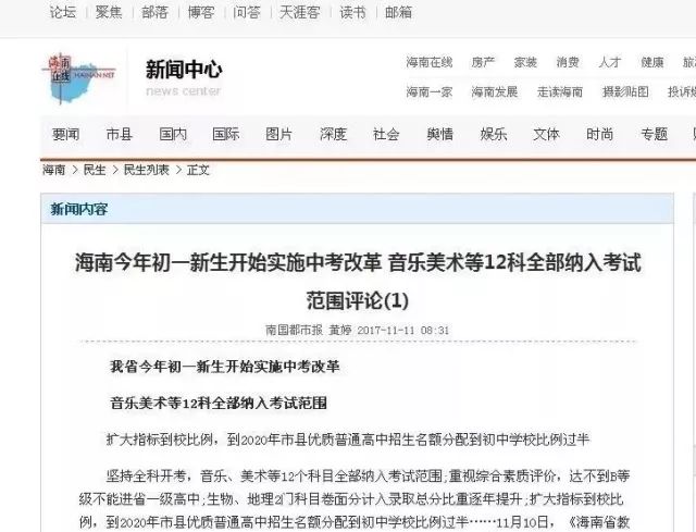 为进一步深化海南省高中阶段学校考试招生制度改革,海南省教育厅制定并实施《关于进一步推进我省高中阶段学校考试招生制度改革的实施意见》。《意见》从2017年秋季入学的义务教育七年级学生开始实施。