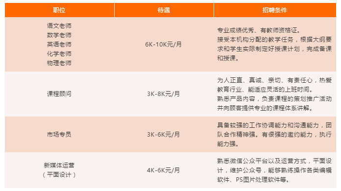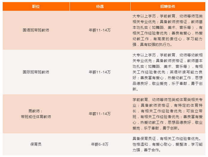 富有竞争力的薪资水平:青年教师税前综合年薪6-10万,以后每年按考核晋级;骨干教师税前综合年薪10-25万,名优特教师税前综合年薪18-35万,特别优秀人才可单议,不封顶。
