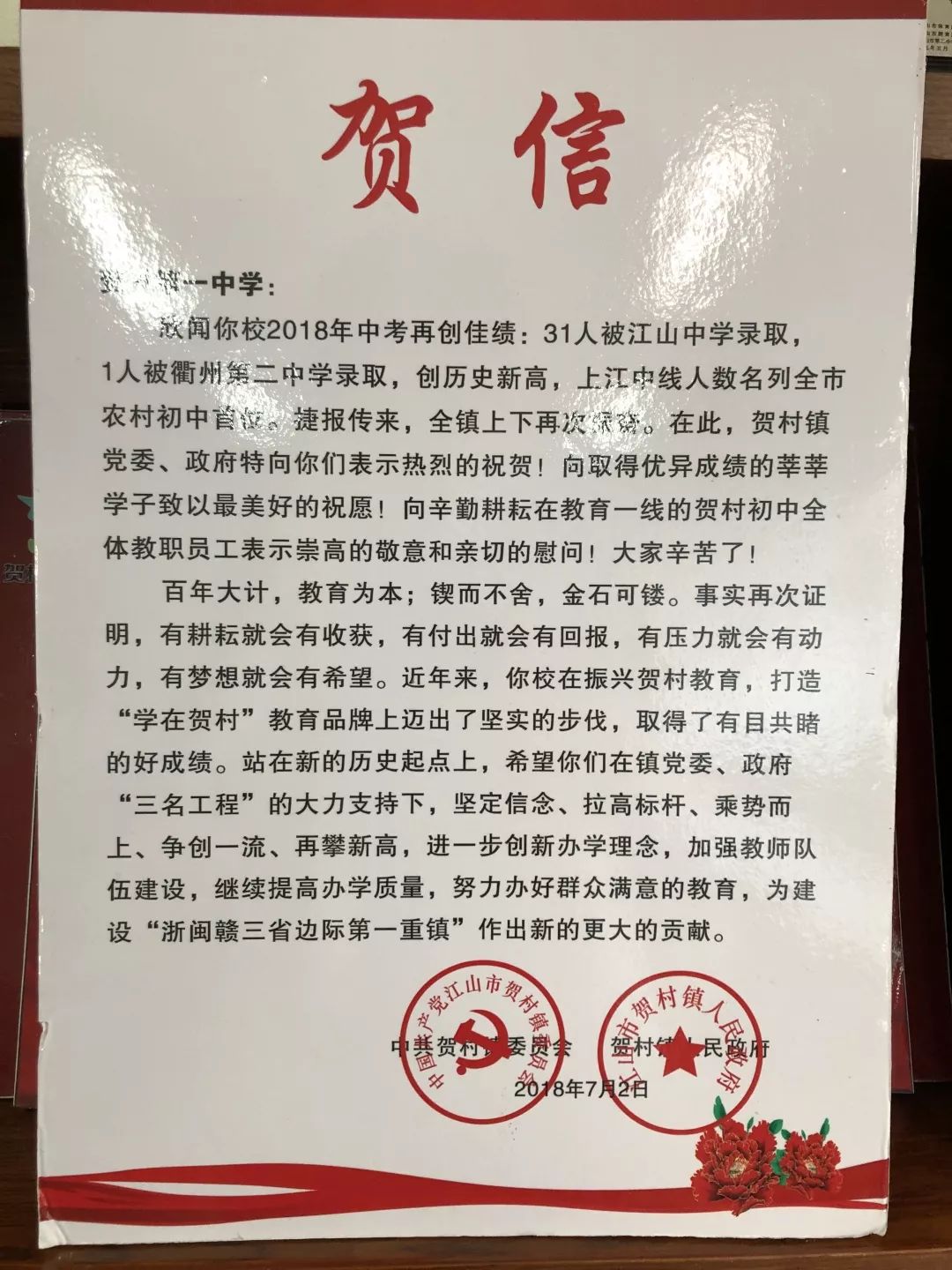 近三年来,贺村一中以推进城乡均衡教育为抓手,强化师德师风建设,实现了“三零”目标,师生形成了“三流”,优质生源外流逐年下降,教学质量实现“三增”(2017到2019年教学质量三连增),如今每年由城区学校转入学生十几人。贺村一中为当地群众及两百多名外来务工人员子女提供便捷优质的服务,美誉度得到大幅提升,成为江山市农村初中一面鲜红的旗帜。2019年6月,浙江电视台教育科技频道对学校进行专题报道。