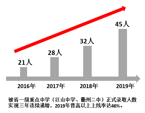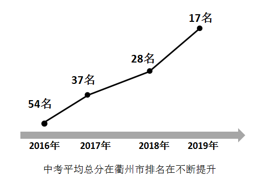 2017年至2019年中考,省一级重点中学录取学生数直线上升,居农村初中第一且优势明显,普高上线率连年刷新记录。中考平均总分从2016年衢州市54名进步到2017年37名,2018年28名,2019年17名,进步率全市前茅。在衢州市暑期教师文化专业考试中收获颇丰,2018年有6人获奖,6个学科获市教育局优胜奖,2019年有9人获奖,获奖人数位居江山市初中段第二。三年来社政学科在衢州地区实现跳跃式发展,2016年中考社政学科在衢州市平均分排名67名,2017中考进步到22名,2018年中考位居衢州市12名,社政教研组获得了“衢州市先进教研组”的称号。