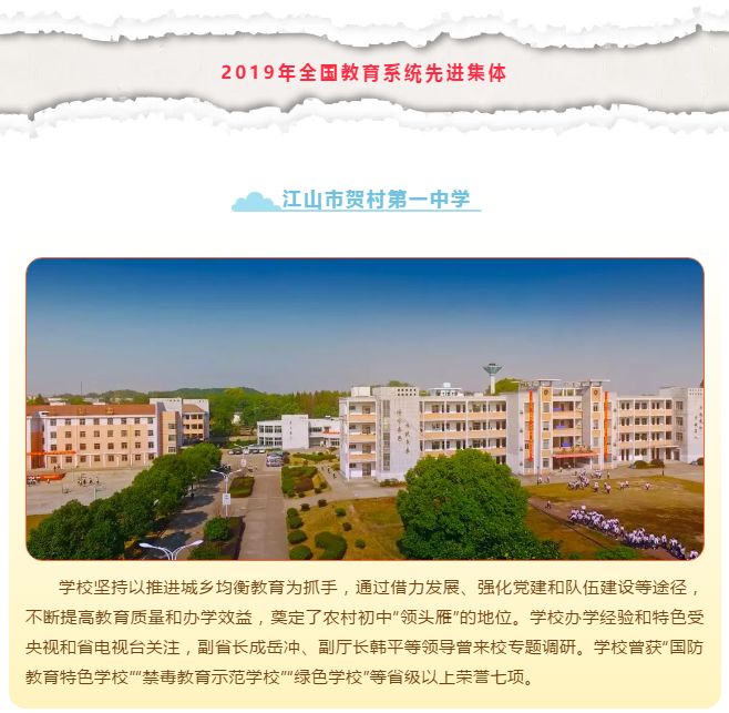 江山市贺村第一中学荣获“全国教育系统先进集体”称号。