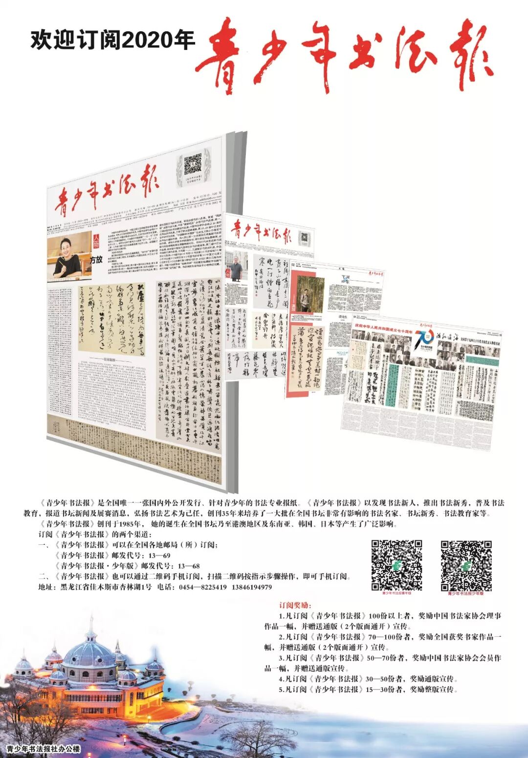 《青少年书法报》邮发代号:13—69《青少年书法报?少年版》邮发代号:13—68二、《青少年书法报》也可以通过扫描二维码手机订阅,扫描二维码按照指示步骤操作,即可手机订阅。地址:黑龙江省佳木斯市向阳区杏林湖1号邮编:154003 电话:0454-8225419 13846194979