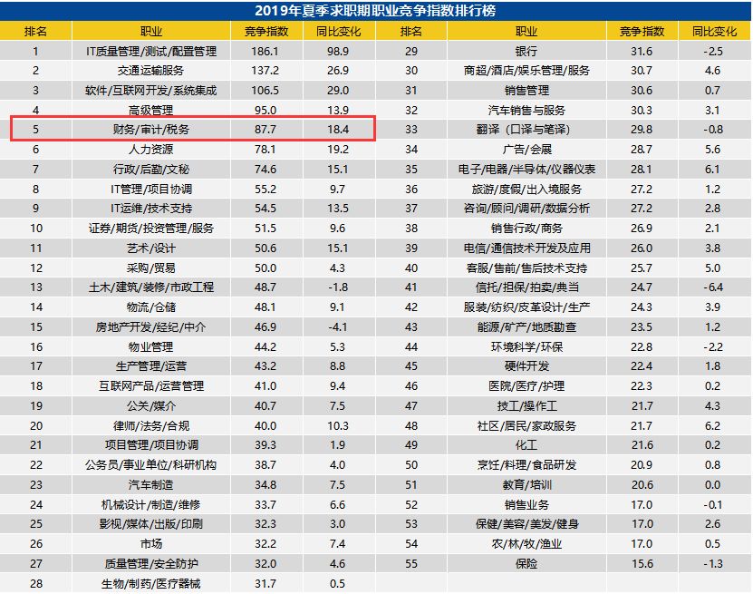 财会正是竞争重灾区。根据《报告》所做的调查,我们“财审税”职业在55个职业竞争排行榜中,排名高居Top5,竞争指数高达87.7,也就是说,“财审税”职业中平均应聘87.7个人,只能竞争上岗1个人
