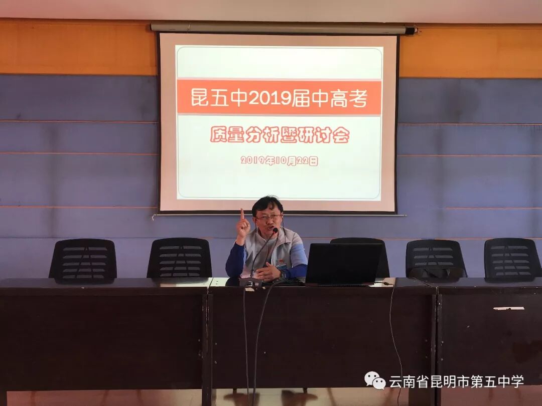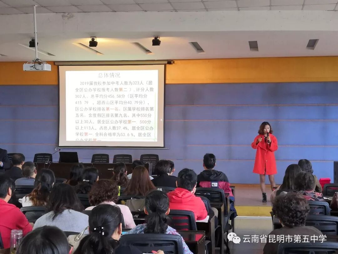 接着由吕萍副校长作2019届中考、高考质量分析。吕副校长结合西山区其余几所公办学校中、高考教学成绩,利用权威数据对昆五中近三年中、高考质量做了对比分析,纵向看变化,横向找差距。我们欣喜的看到,学校中、高考质量不断提升,飞速发展。尤其是在中考人数众多,学生参差不齐的情况下,我校平均分稳居区公办学校排名第一。其中550分、500分以上数人及全科合格率,同样稳居全区公办学校第一。综合近三年的高考情况分析,2019届高考本科率也稳步提升。吕副校长结合学校实际提出了2020届中、高考备考的思路及今后在备考中需要关注的问题。要求各位老师对优等生的培养、中等生的促进、后进生的帮扶,必须有方法、有策略,各学科老师需形成教学合力,共同提高。