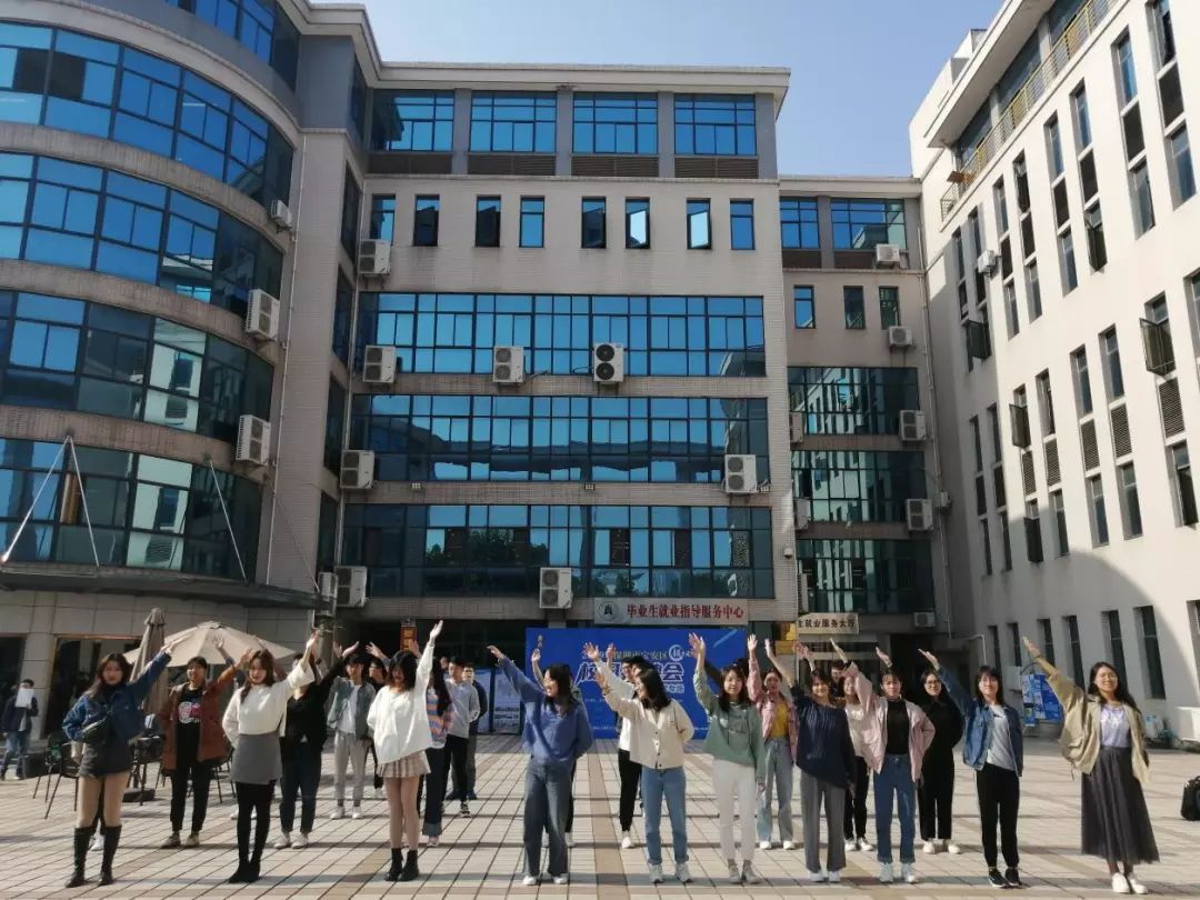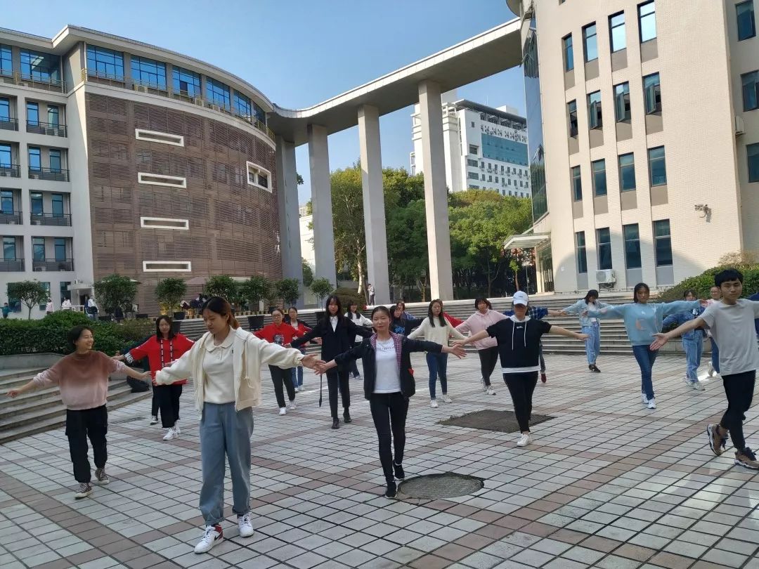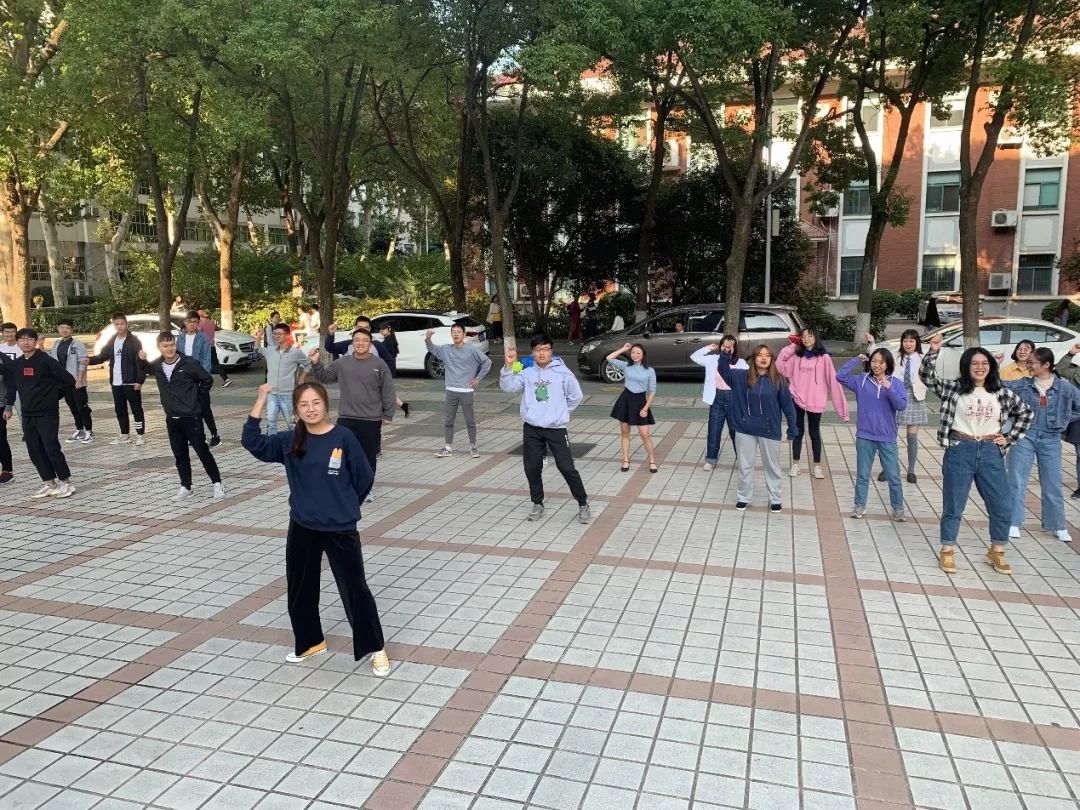 会计学1801班同学在逸夫人文楼前排练本学期的健排舞,同学们热情高涨,随着音乐不断地校正自己的每一个动作,展现着青春的色彩。