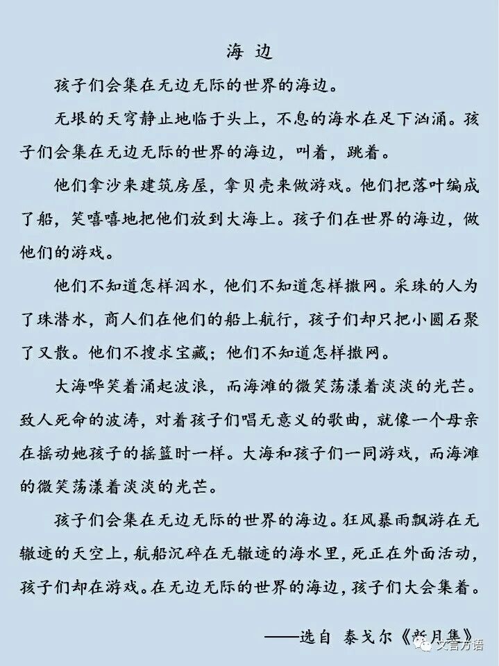 今晚,我们将分享泰戈尔《新月集》的《海边》。同一片海,在孩子和成人的眼中,却有不一样的风景。