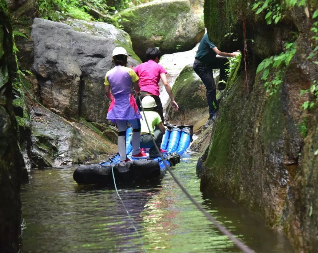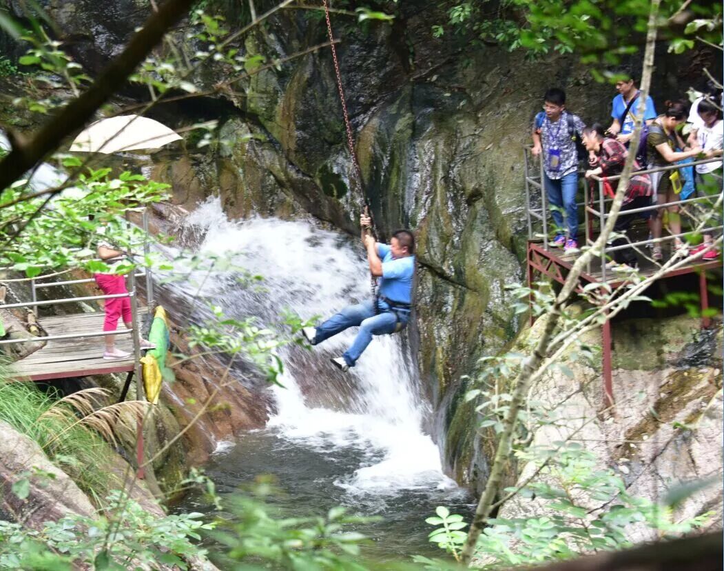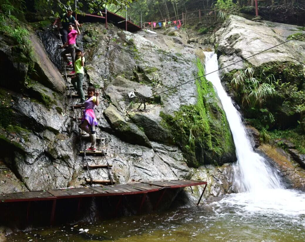 峡谷全长三公里 瀑布20余个把瀑布和游客紧密的联系起来把看瀑布变成走瀑布,攀瀑布,把一个个瀑布和深潭通过游玩项目和游客巧妙的结合起来,让您在幽静的峡谷中戏水玩瀑,妹子们走钢丝索桥。