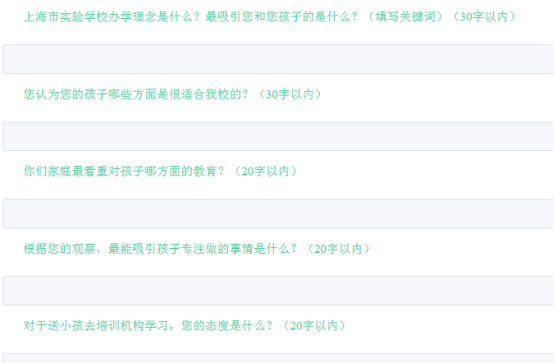 2019年上实报名再也没有让家长长篇大论去写简介,而是换成了5道问题,被家长们戏称为“灵魂五问”,每个问题需要用20-30个字简答即可,让我们来看一下: