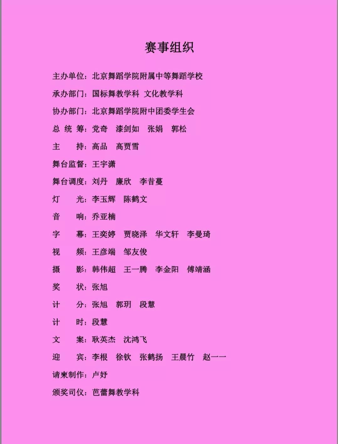 此次比赛是北京舞蹈学院附中“不忘初心,牢记使命”主题教育活动的重要内容。由国标舞教学科和文化课教学科承办,附中团委学生会协办。按照赛制,前期经过了各教学科初赛和校级复赛等环节。活动中,得到了附中校领导、各部门的大力支持。附中学生会的同学们积极协助老师工作,显示了我校团学组织的超强的凝聚力和战斗力。承办部门国标舞教学科和文化教学科团结协作、上下齐心,体现了我校教师队伍的严谨规范、表率担当的工作风格。附中各部门通力配合,保证了活动的圆满成功。