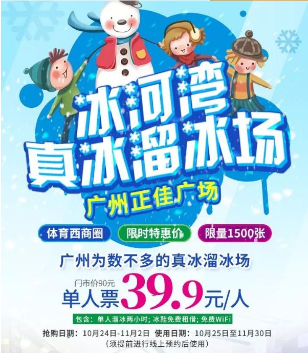 【广州】39.9元抢广州正佳冰河湾真冰溜冰场单人2小时门票