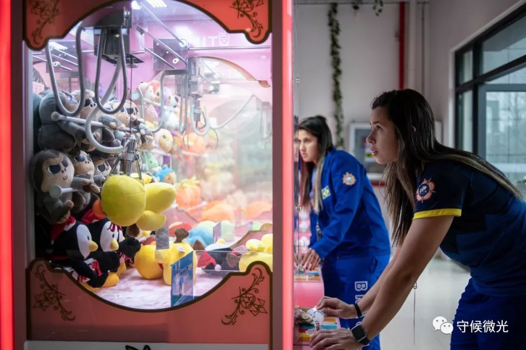 10月22日,巴西运动员在军运村里玩抓娃娃机。除了抓娃娃,军运村中的电玩店还设有跳舞机、投篮机等游戏设备,使用时需购买代币,价格为每枚一元人民币。
