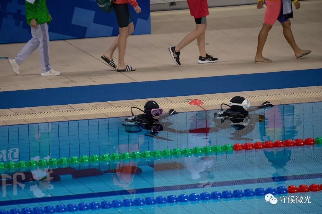 10月20日,水上救生比赛前,负责摆放救生用假人的潜水员在水池一侧待命。