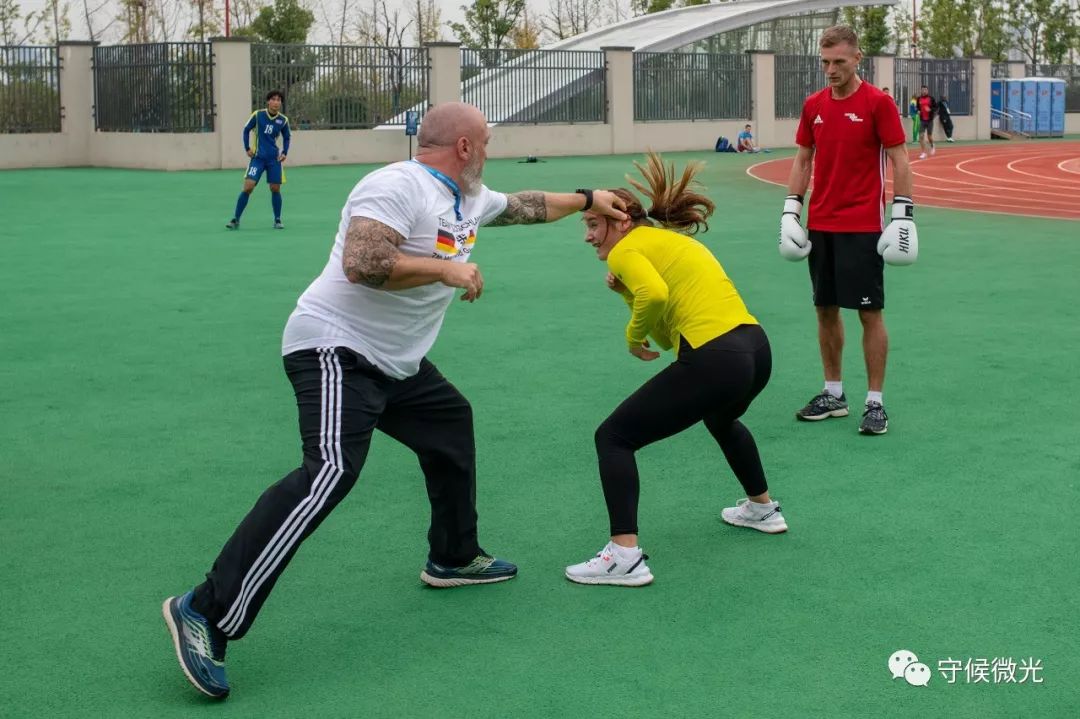 10月22日,武汉市江夏区黄家湖畔,德国拳击运动员和教练在军运村里训练。