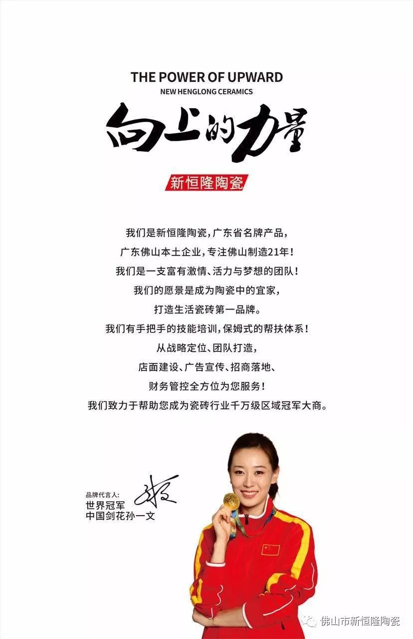 2017年11月26日,新恒隆企业正式签约世界女子击剑冠军【孙一文】为形象代言人!孙一文低调、务实,没有大牌明星的流量!但她形象正面、健康,充满向上的力量!其坚强不屈,勇于攀登的可贵品格与新恒隆企业21年始终专注做好瓷砖的理念如出一辙!正是这份运动员身上可贵的质朴与磨炼不凡的意志,让我们毅然决然的签下了她,一起与中国国家队运动健儿同呼吸,共成长!