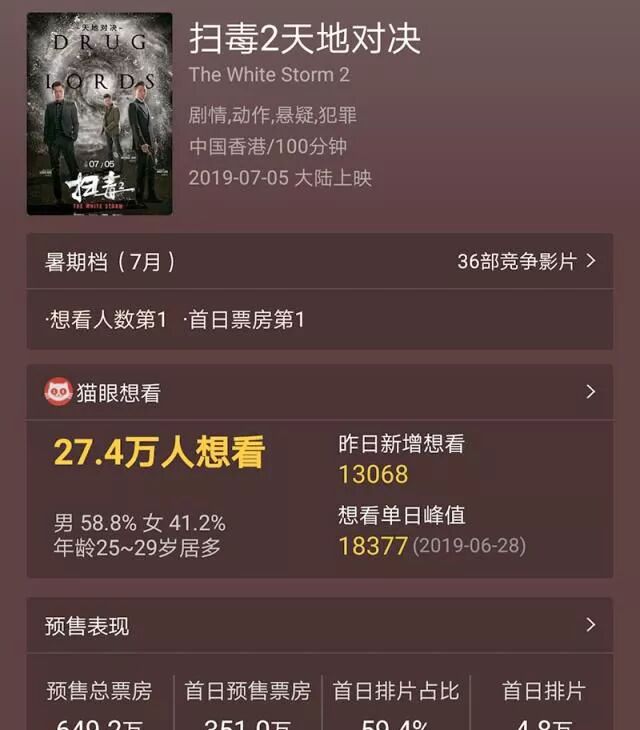 古天乐、刘德华、苗侨伟、林嘉欣主演的电影《扫毒2:天地对决》,将于本月5日正式上映,从猫眼平台传来的数据来看,在7月份将要上映的36部影片当中,《扫毒2》获得了两项第一:即想看人数第一,首日票房第一。