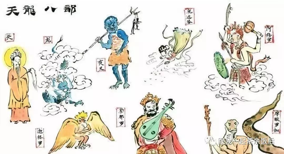 龙众指的是天赋卓然、最后成为大理皇帝的段誉;夜叉指的是好坏难以一言以蔽之的四大恶人;乾闼婆指的是擅长易容术、娇俏灵动、最后死于爱人之手的阿朱;阿修罗指的一腔鸿志却在江湖、理想、爱情上全方面败北的慕容复;迦楼罗指的是宝象庄严但最后走火入魔的鸠摩智;紧那罗指的是狠毒狡诈但又单纯痴情的阿紫;摩呼罗伽指的是原本资质平庸却因机缘巧合、脱胎换骨的虚竹。