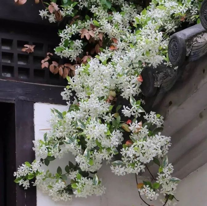 自从在朋友家中毒之后,便自己买了一颗小苗来种。我发现这花真是越种越喜欢。它的花朵很有特点,长得像风车的扇片,又像佛教的“卍”字,怪不得叫风车茉莉。花量巨大,香味也很浓郁,百花齐放时仿佛墙上附了层白雪。