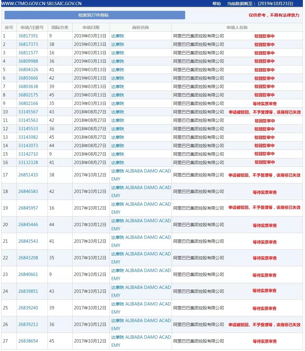 资料显示,阿里巴巴达摩院成立于2017年10月11日,也就在隔天,12日,阿里就申请了商标。