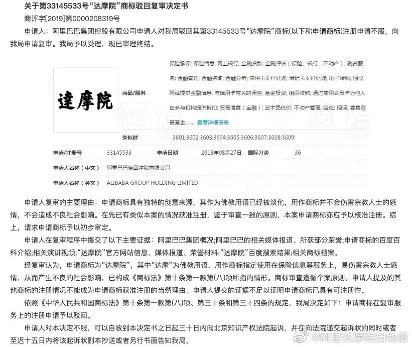 根据网上流传的一份《关于第33145533号“达摩院”商标驳回复审决定书》可以看到,阿里于2018年8月27日提交商标申请,用于金融保险、金融贷款等领域,今年年初被商标局驳回,随后阿里提交了驳回复审,仍被拒绝。