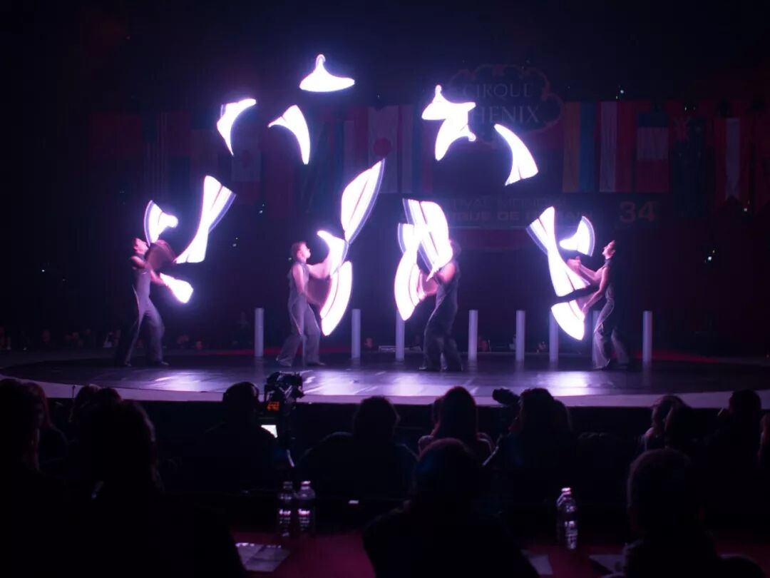 奥地利这次参赛的节目《夜光集体手技》,从表演形式和色彩变换上又有新的突破,四个演员表演的《夜光集体手技》从编排上强调了技巧统一,四人演员演的“扔三个棒”动作一致,扔棒的高度,换接时间非常协调,转身和步伐整齐化一。无论是扔五个棒技巧还是四个演员群传十五个棒,它的背景图案,根据每个棒的颜色不同,配合的五光十色,十分艳丽,给杂技赛场增添了新的光彩,这在杂技舞台上是不多见的。