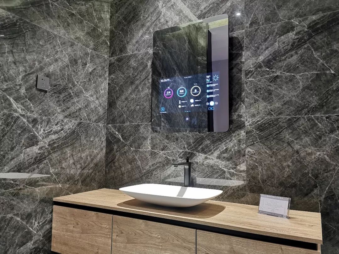 智能魔镜手指一滑打开智能魔镜,一边洗漱一边听音乐、查看天气和新闻,并远程操控通过音乐和灯光叫孩子起床。