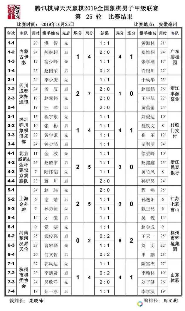 其余各场,四川龙翔通讯队7比1大胜浙江丰源泵业队,深圳弈川队4比4战平付临门黑龙江队,杭州棋协4比4打平山东体彩队,上海金外滩队5比3战胜江苏七彩曹山队。