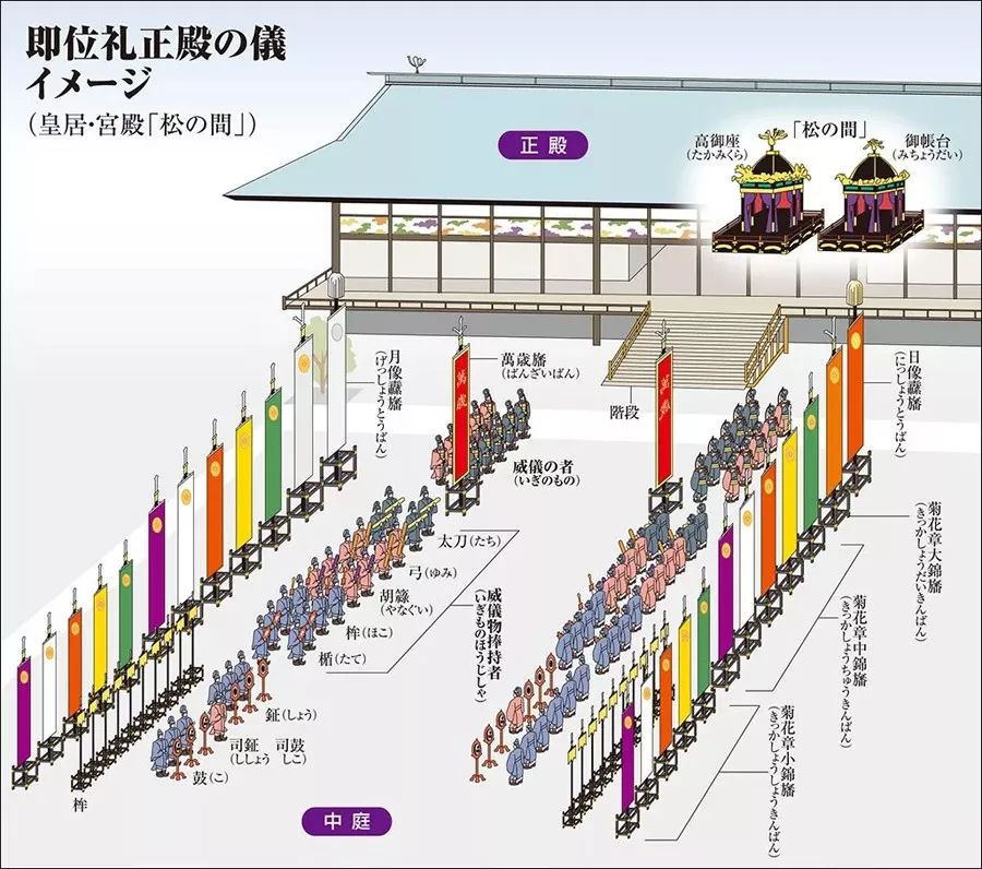 天皇和皇后双双向来宾致敬,并接受来宾答礼。除了在“松之间”内参与仪式的主要人员,其他来宾在正殿前中庭四周的房间或回廊落座,现场设置了30台显示器,可以观看仪式的情形。