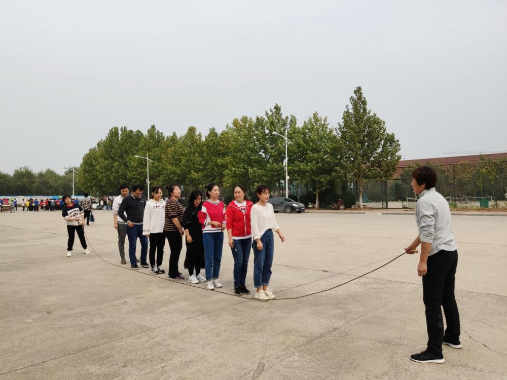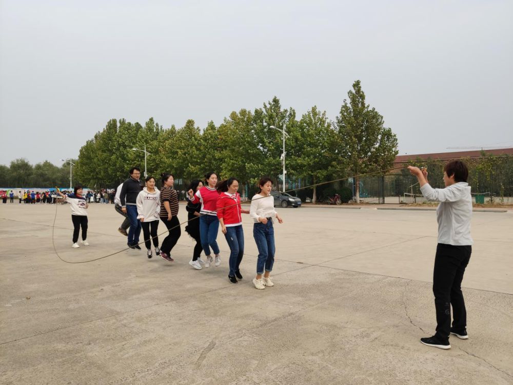 在跳大绳比赛现场,老师们喊着整齐的口号完美起跳,在比赛过程中,默契配合、从容跳跃。