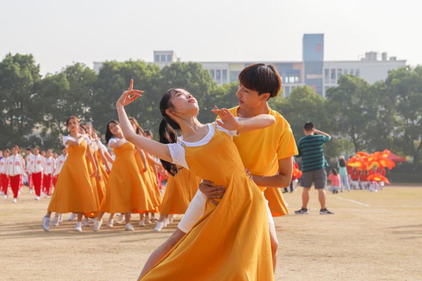 排舞赛场上,电艺学子身着黄色连衣裙,手持红色绸锻,配合着一曲《我爱你中国》,在赛场上热情舞动。日复一日的艰苦训练为的是今日的风采时刻,最终斩获排舞比赛第二名。