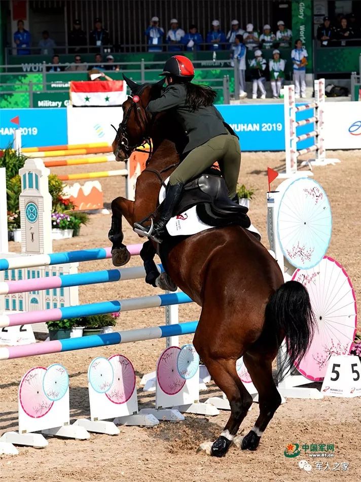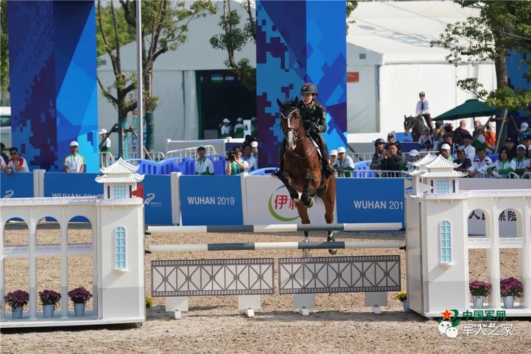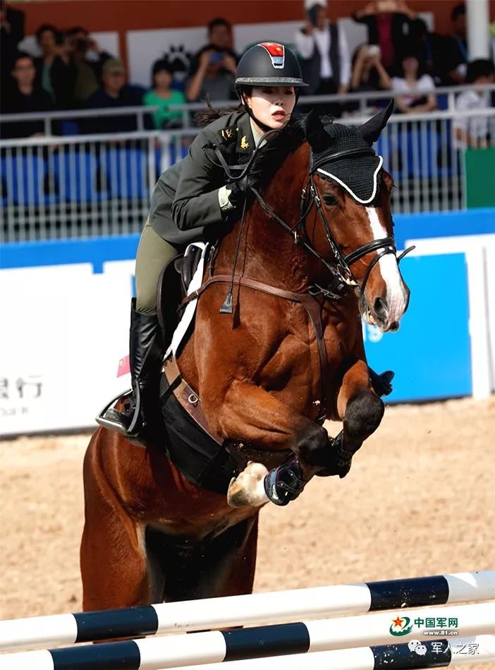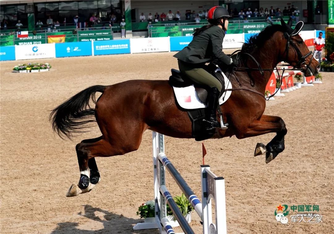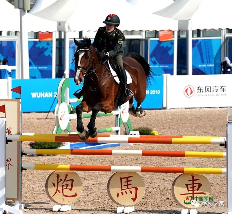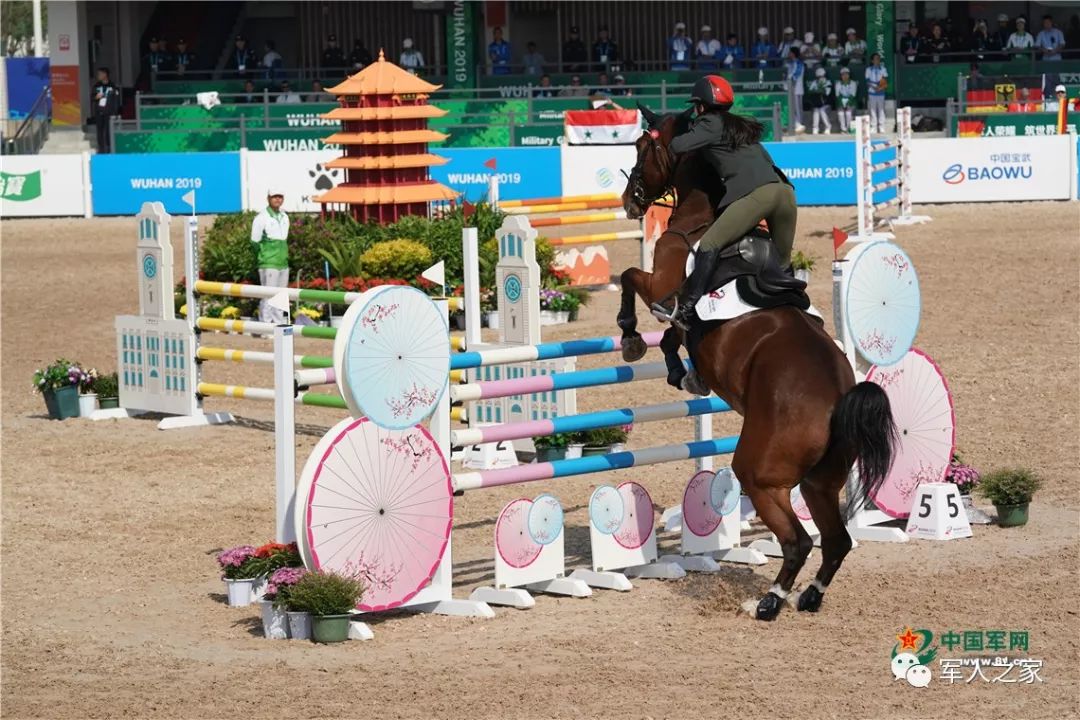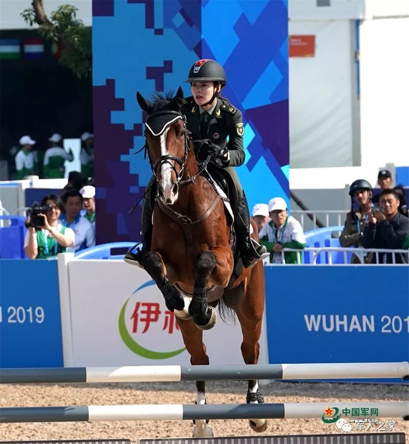10月21日,世界军人运动会马术场地障碍赛上,中国女选手田羽(下士)在比赛中。