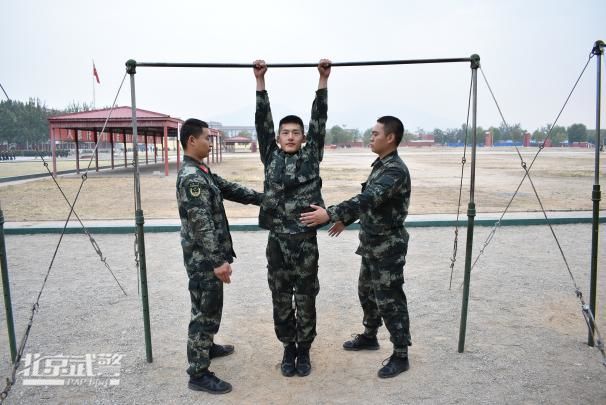 在完成动作过程中,班长站在新同志身后,双手托腰,向上助力新同志完成动作。