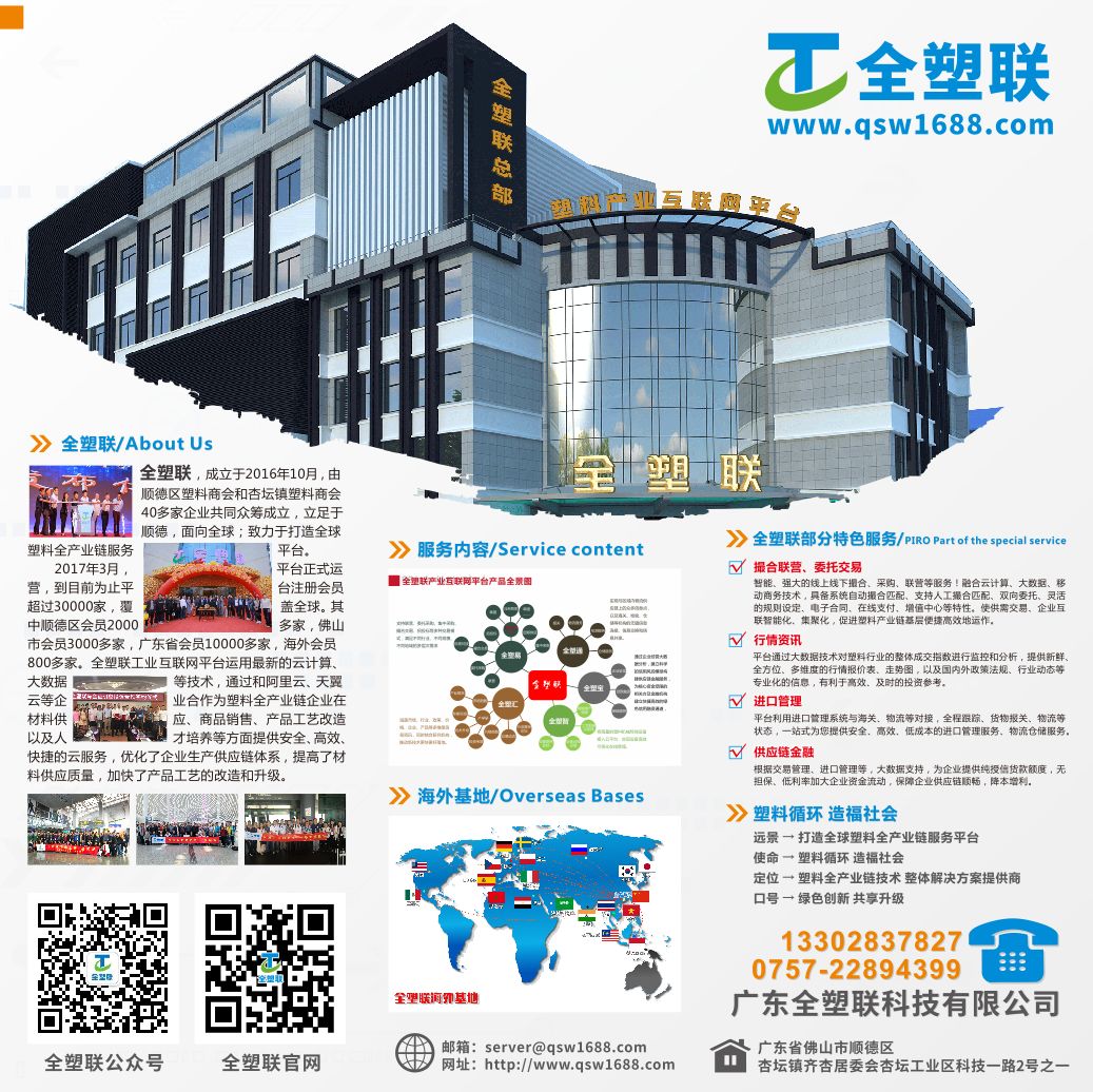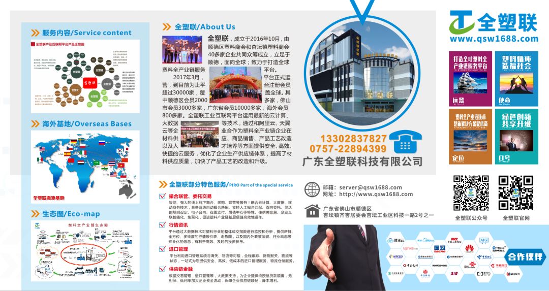 全塑联,成立于2016年10月,由顺德区塑料商会和杏坛镇塑料商会40多家企业共同众筹成立,立足于顺德,面向全球,致力于打造全球塑料全产业链服务平台。 2017年3月,平台正式运营,到目前为止平台注册会员30000家,覆盖全球。其中顺德区会员2000多家,佛山市会员3000多家,广东省会员10000多家,海外会员800多家。全塑联工业互联网平台运用最新的云计算、大数据等技术,通过阿里云、天翼云等企业合作为塑料全产业链企业在材料供应、商品销售、产品工艺改造以及人才培养等方面提供安全、高效、快捷的云服务,优化了企业生产供应链体系,提高了材料供应质量,加快了产品工艺的改造和升级。